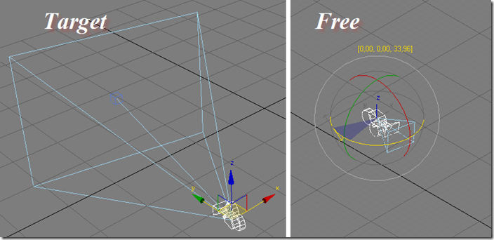 Las cámaras disponibles son de dos tipos, las que tienen "objetivo" (Target), que permiten manipular la ubicación de la cámara y la de su objetivo, y las que no lo tienen, por lo que sólo permiten manipular la cámara. A estas últimas se las conoce como "libres" (Free). Ambos tipos de cámaras se crean desde el panel de comandos Create, designando la categoría Cameras.